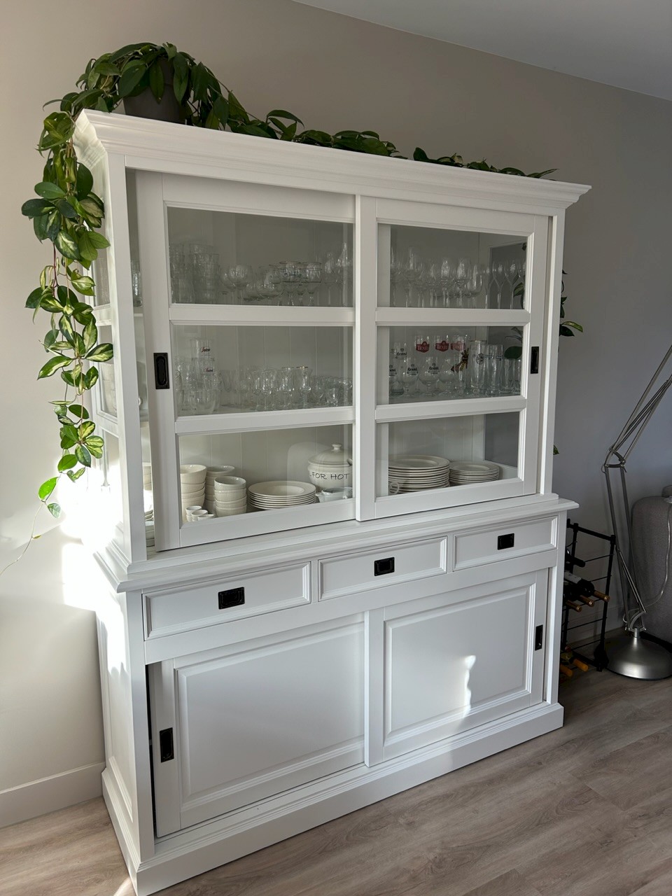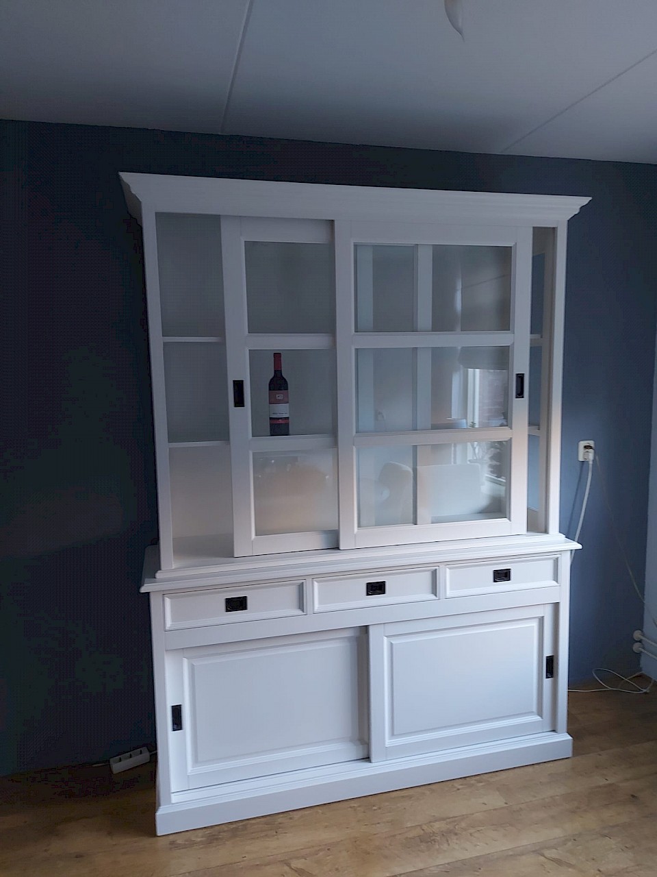 Gisteren is onze nieuwe kast geleverd. Mooie kwaliteit, alle deuren schuiven perfect. Eindelijk weer genoeg ruimte voor al het servies en de glazen. En dan ook nog een lekker flesje wijn cadeau!