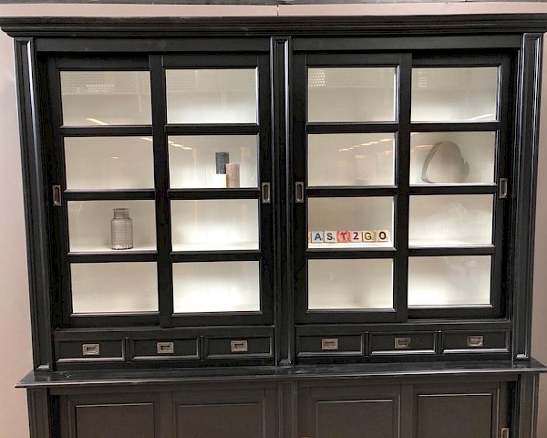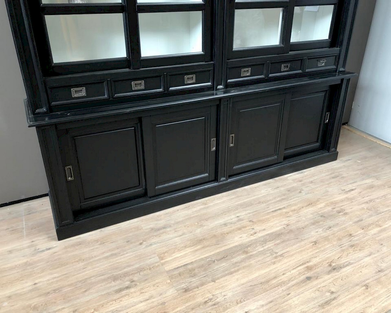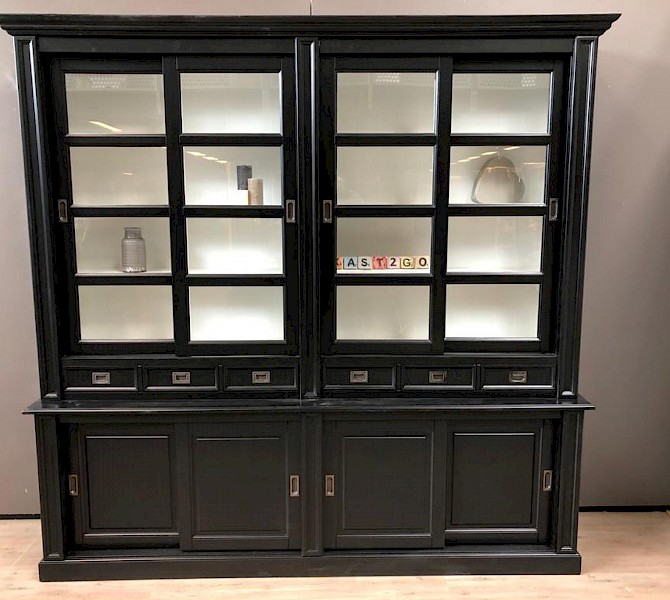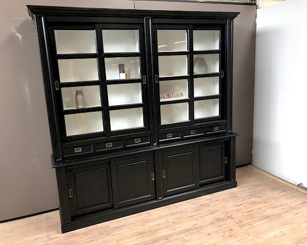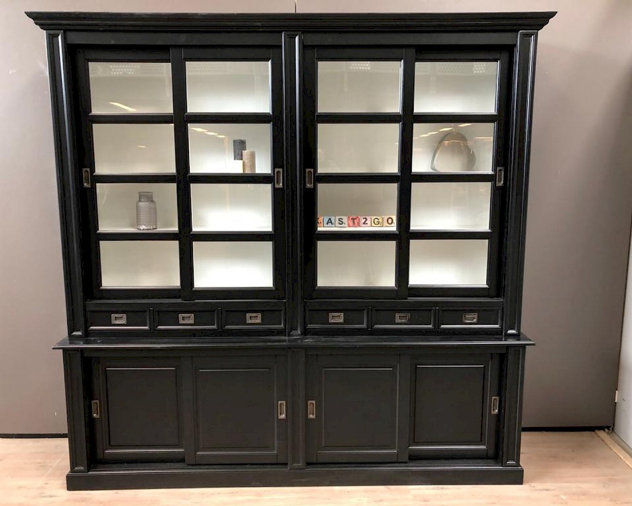 Diesem buffetschrank/vitrinenschrank ist innen weiss und außen swartz glatt lackiert. Der obere Teil besteht aus 2 Teilen und einem Dachhimmel. Denn schrank enthält sowohl oben als auch unten 4 Schiebetüren, zusätzlich hat das denn buffetschrank 6 Schubladen. Eine schöne Vitrine, die sowohl zu einem klassischen als auch zu einem modernen Interieur passt. Der Schrank kann innen / außen in verschiedenen Farben gewählt werden, zB anthrazit / schwarz / weiß