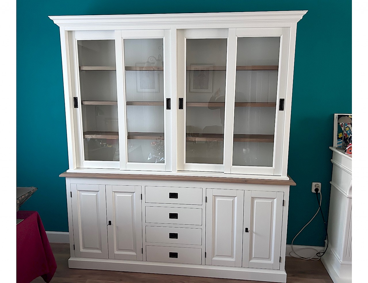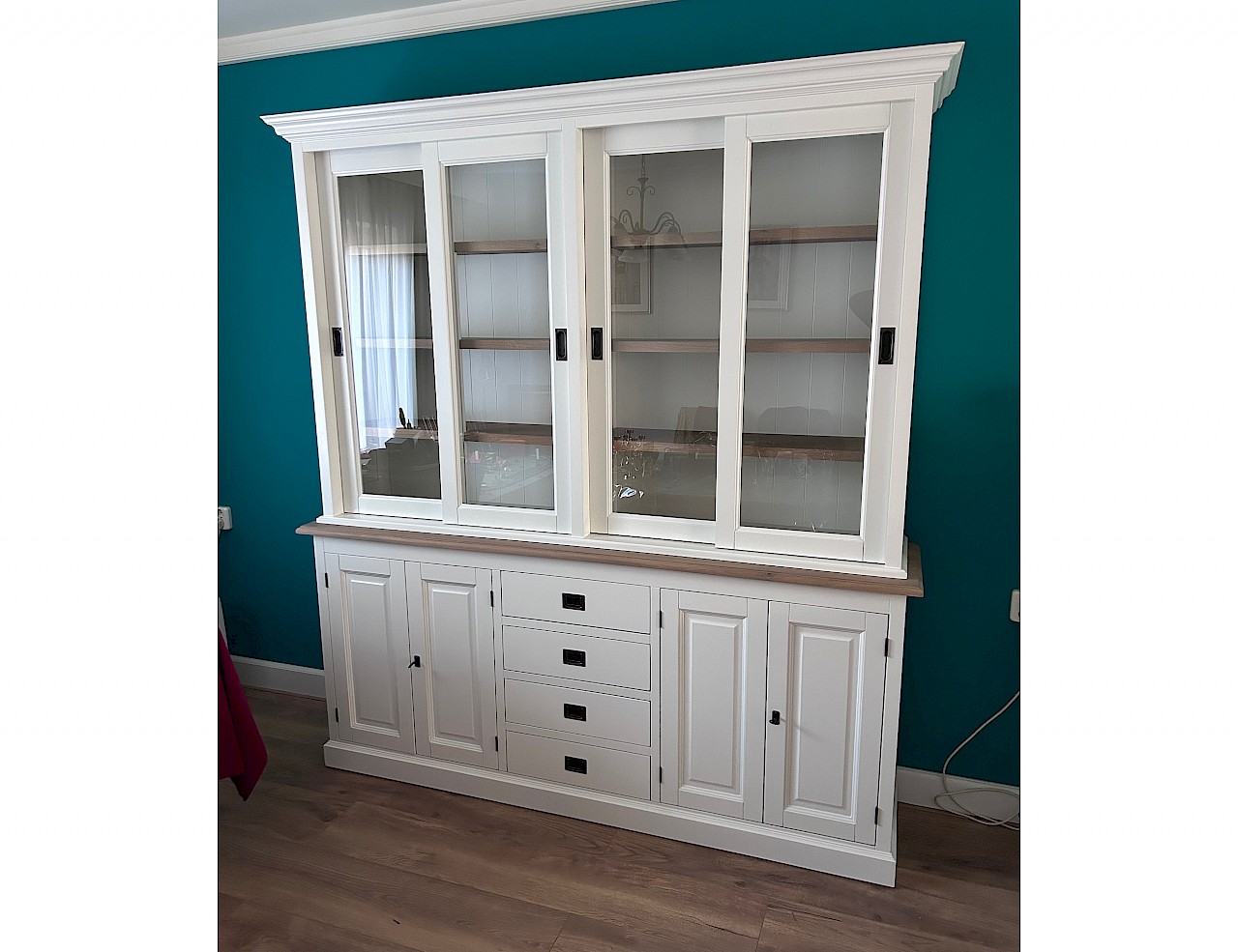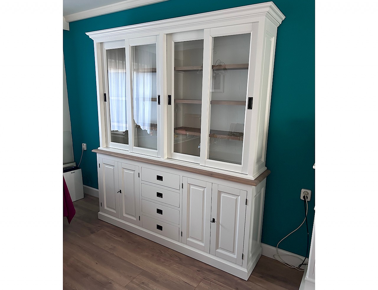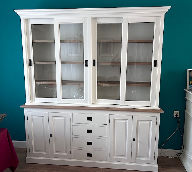 Dieses schöne weiße Buffetschränk kann der Hingucker in Ihrem Wohnraum sein! Ein zeitloser Look, der sowohl in ein modernes als auch in ein klassisches Interieur passt. Der Schrank enthält 4 Schiebetüren über einer Reihe von Schubladen. Die Herstellung erfolgt mit hoher Qualität, so dass Schubladen auf Führungen (SOFT-CLOSING) und Schiebetüren auf Schienen gleiten können. Dieser schöne Schrank besteht aus zwei Teilen und ist somit leicht zu transportieren. Die Regale und das Regal sind aus geräucherter Eiche, die eine wundervolle warme Wirkung erzeugt. Einzigartige Kombination.