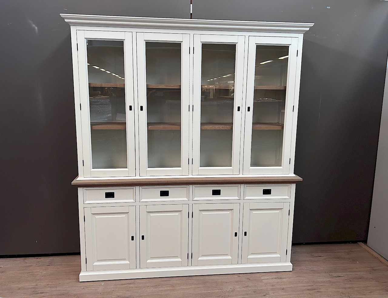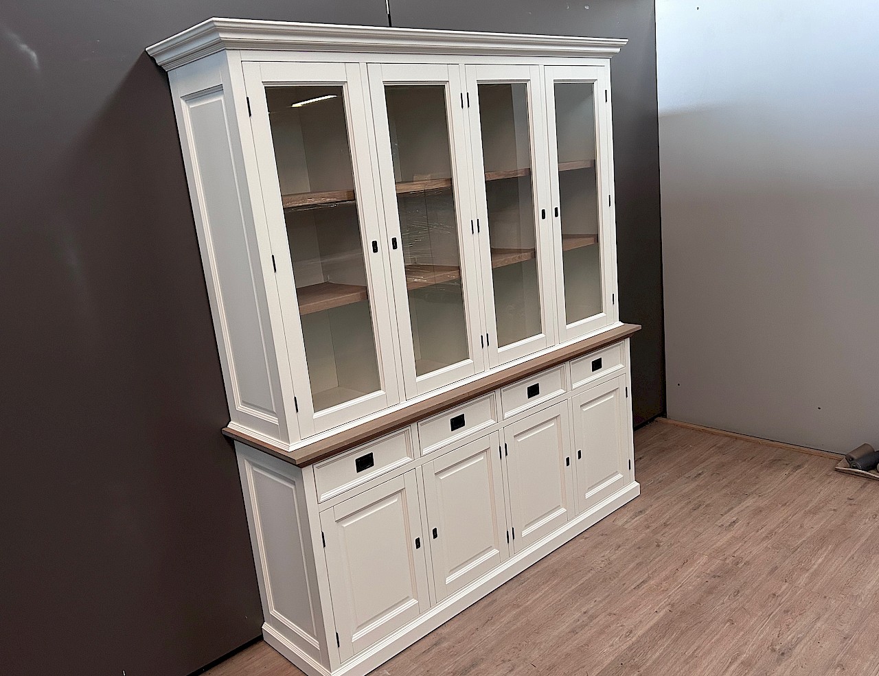 Dieses schöne weiße Buffetschrank/vitrinenschrank London 240 kann der Hingucker in Ihrem Wohnraum sein! Ein zeitloser Look, der sowohl in ein modernes als auch in ein klassisches Interieur passt. Der Schrank enthält zwei Türen, oben und unten, sowie eine Reihe von Schubladen. Die Herstellung erfolgt mit hoher Qualität, die Schubladen sind sanft schließend. Dieser schöne Schrank besteht aus zwei Teilen und ist somit leicht zu transportieren.