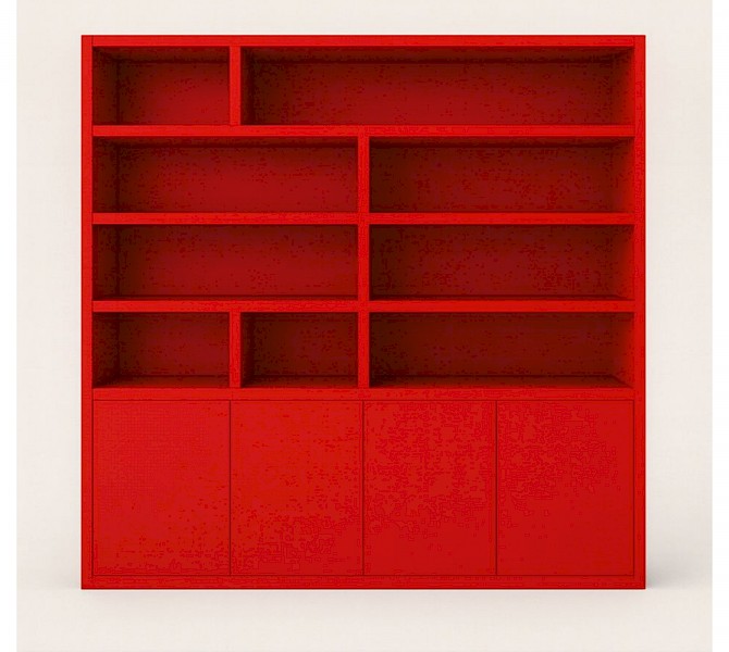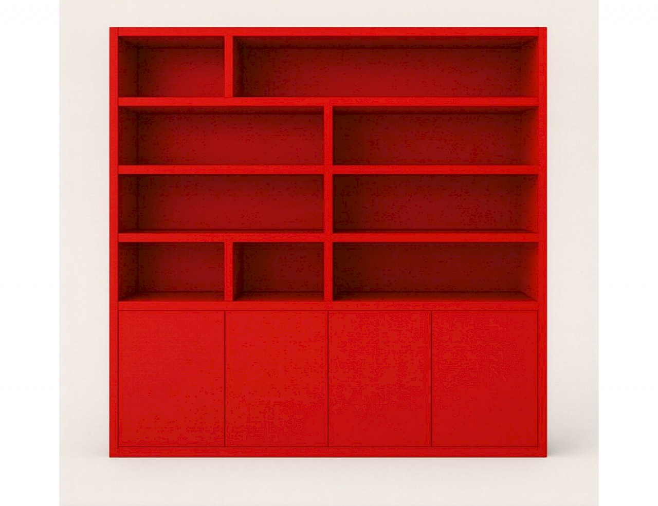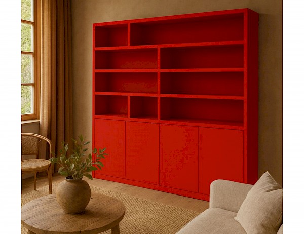 Dieses Regalsystem bietet sowohl geschlossene als auch offene Fächer. Der untere Teil verfügt über vier Push-to-Open-Türen, die Zugang zu einem geräumigen, geschlossenen Stauraum bieten. Dank des grifflosen Systems wirkt das Design elegant und nahtlos.