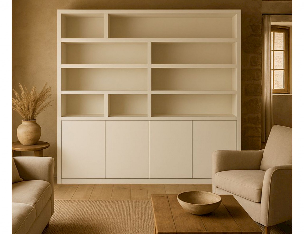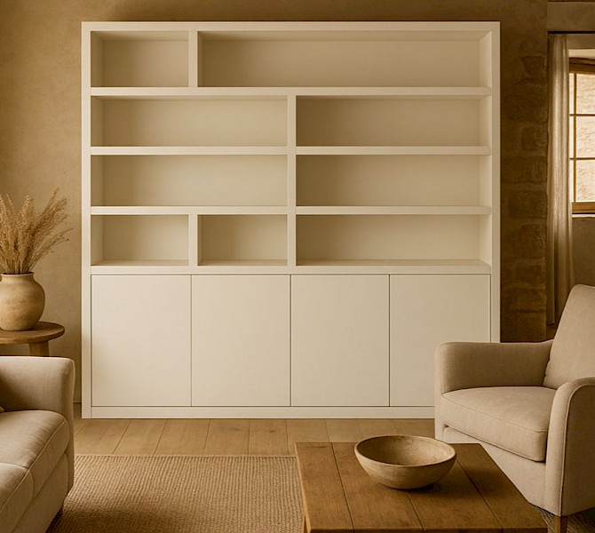 Dieses Regalsystem bietet sowohl geschlossene als auch offene Fächer. Der untere Teil verfügt über vier Push-to-Open-Türen, die Zugang zu einem geräumigen, geschlossenen Stauraum bieten. Dank des grifflosen Systems wirkt das Design elegant und nahtlos.