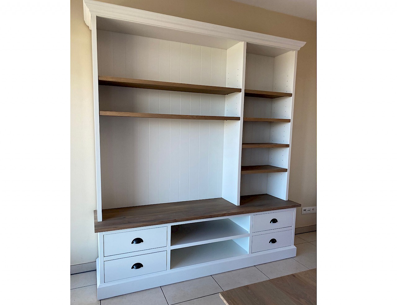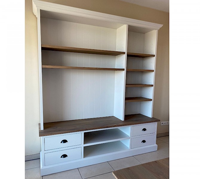 Diese Kombination wurde speziell für einen Kunden angefertigt, der einen 190 cm breiten Fernsehschrank mit einem darüberliegenden Schrank wünschte, der nach seinen eigenen Vorstellungen angeordnet werden sollte.